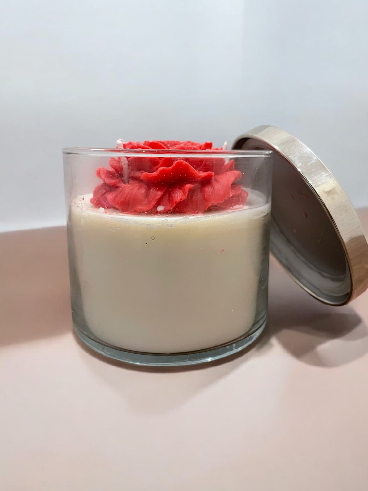 Perfect for romantic settings, festive gifting, or a self-care evening, this candle blends soothing scents with visual beauty. The reusable glass jar and clean-burning wax make it an aesthetic addition to any space.